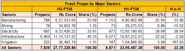 The investment momentum that gathered pace in the latter half of FY2025 extended into the first half of FY2026, though the pace of expansion differed across sectors and ownership groups. During H1-FY25 (April–Sept 2025), the country saw 8,871 new projects worth Rs 33,95,487.38 crore, up 22.26 percent over H2-FY25. The expansion was led by Manufacturing and Electricity, while Infrastructure activity softened following a pause in large government capex proposals.
