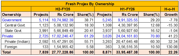 The investment cycle stayed firm in H1-FY26, but the mix tilted further to the private side. Private promoters lifted outlays by 41.2% to Rs 24.04 lakh crore, taking their share of the total to 70.8% (from 61.3% in H2-FY25). Government proposals, in contrast, eased 7.8% to Rs 9.91 lakh crore, pulling the public share down to 29.2% (from 38.7%).