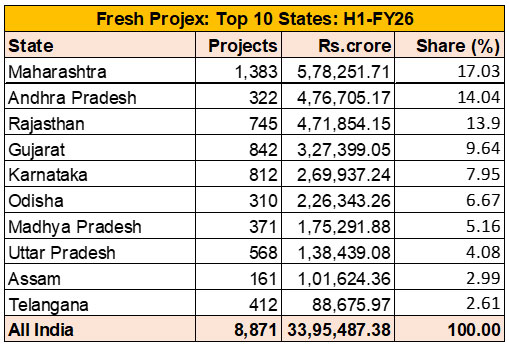 Uttar Pradesh’s project value rose 16.12 percent to Rs 1,38,439 crore, lifting it to eighth place. The half-year featured several high-value central government and private investments: THDC India’s Rs 12,365 crore Khurja thermal plant, Tata Power Renewable Energy’s Rs 13,700 crore ultra-supercritical unit (Bundelkhand), and NHAI’s Rs 9,200 crore Ayodhya–Varanasi express corridor.